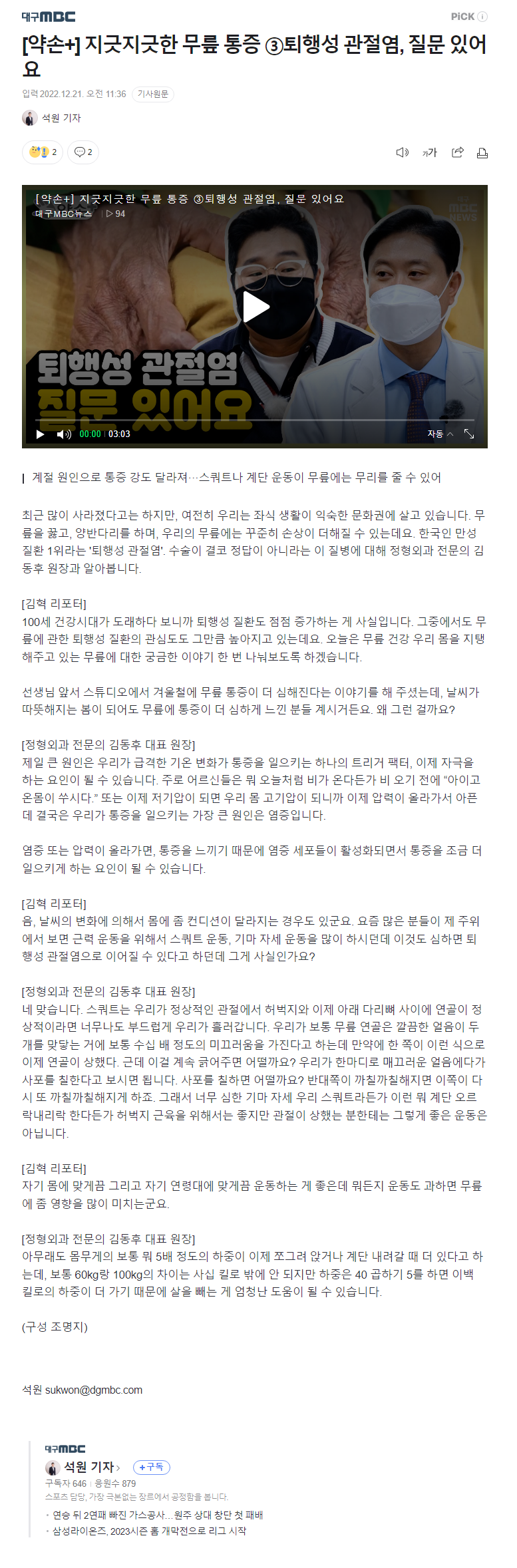 TV 메디컬 약손 출연 , 김동후대표원장님 대구 mbc 신문기사 - 3 (12월21일)