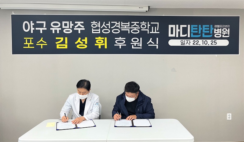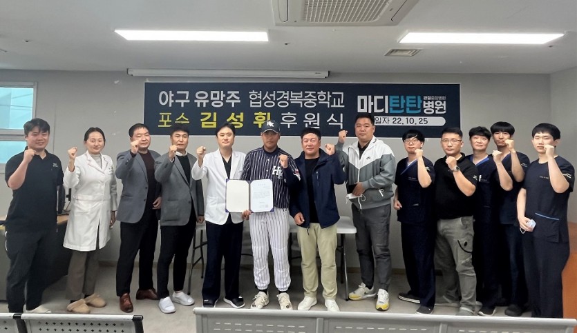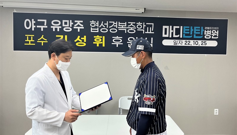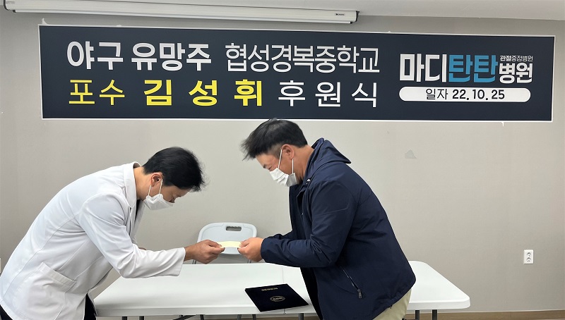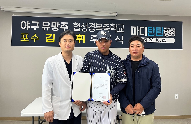 본원 마디탄탄병원 7층에서 협성경복중학교 야구 유망주 포수 김성휘 선수의 후원식이 있었습니다.