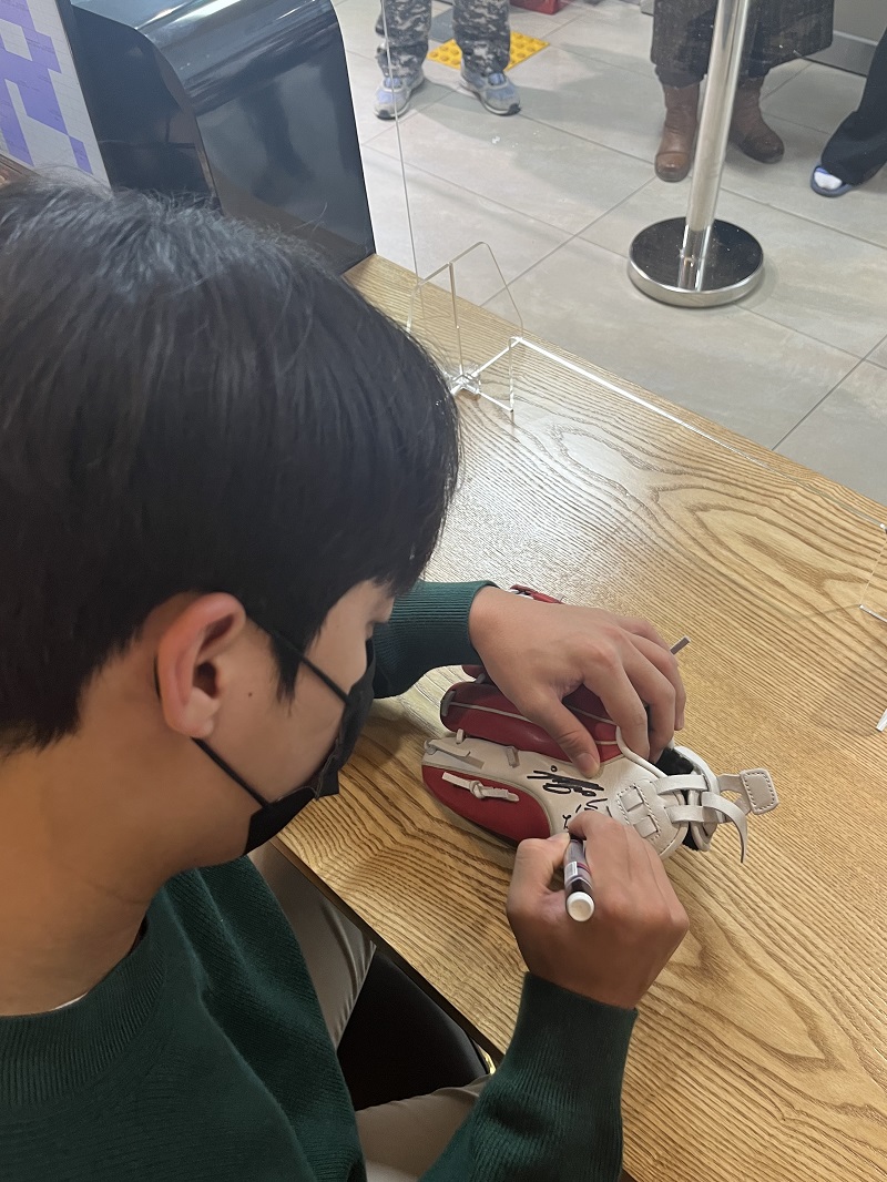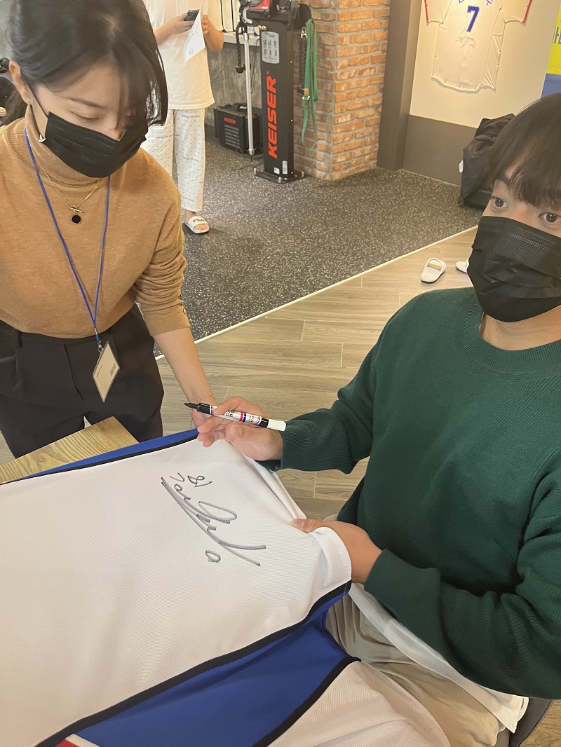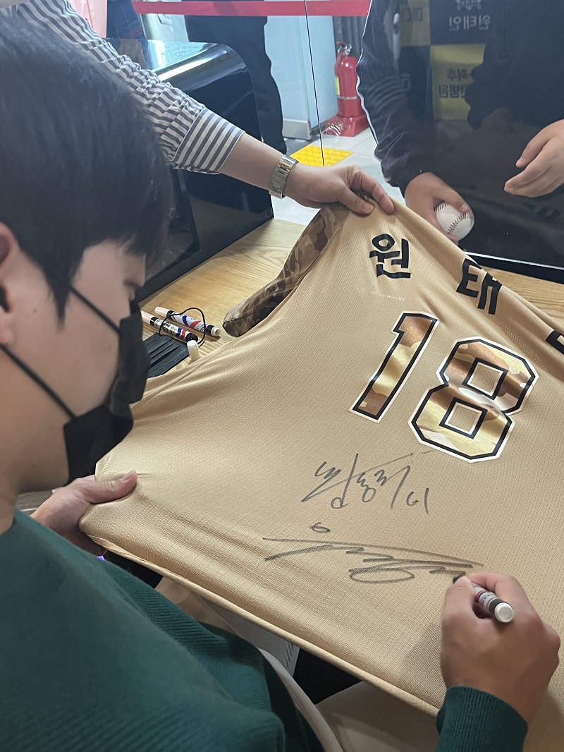 직접 가져오신 유니폼 , 글러브, 야구공, 개인물품 등에 사인을 받고 원태인선수와 함께 기념촬영을 한분한분씩 해드렸습니다.