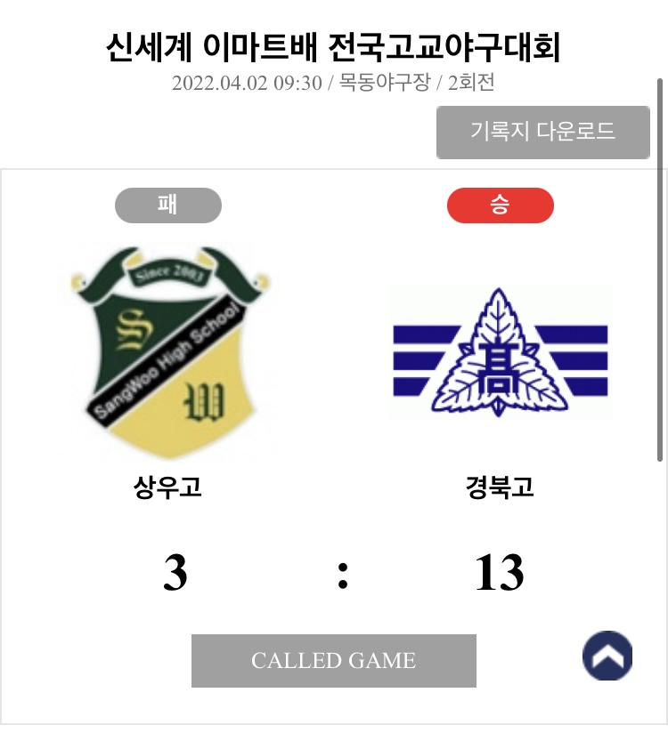 4월 2일 상우고 대 경북고 경기에서 경북고 콜드승을 거둠과 함께