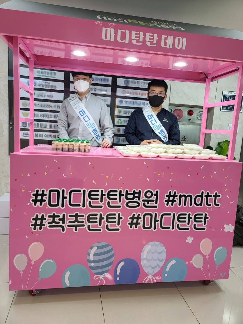 2022년04월19일 마디탄탄데이행사 페이지 정보 작성자 최고관리자 댓글 0건 조회 1,168회 작성일 22-04-21 17:53 본문 2022년 04월 19일 마디탄탄데이 행사저희 마디탄탄병원에서 탄탄데이 2주년을 맞이하여 환자분들에게 항상 감사한 마음과 완쾌하시길 바라는 마음을 담아 떡과 요구르트를 나눠드렸습니다언제나 본원을 찾아주시는 모든 환자분들을 내 가족처럼 생각하고 진료하여 통증없는 편안한 일상을 되찾아 드리기위해 온 노력을 다하겠습니다 감사합니다 관절 척추수술 및 재활은 마디탄탄병원! 목록 이전글2022년 5월 9일 월례조회 22.05.09 다음글마디탄탄병원 전속모델 원태인선수의 호투가 빛났습니다! 7이닝 무실점 ! 22.04.13 댓글목록 댓글목록 등록된 댓글이 없습니다.