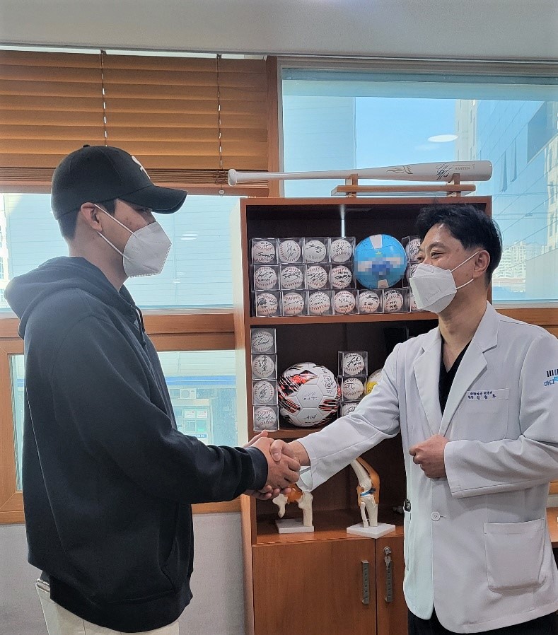 삼성 오0민 선수분께서 김동후 원장님께 감사인사차 병원을 내원하셨습니다
