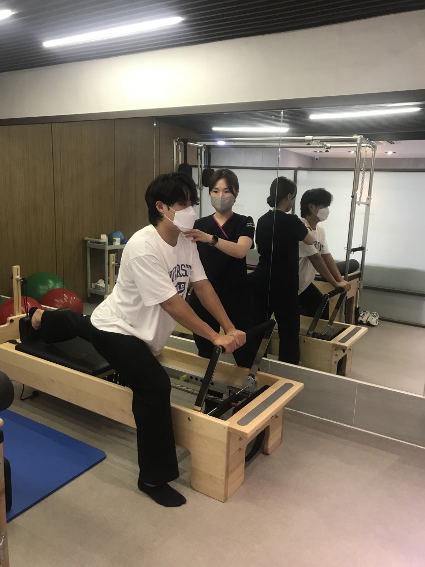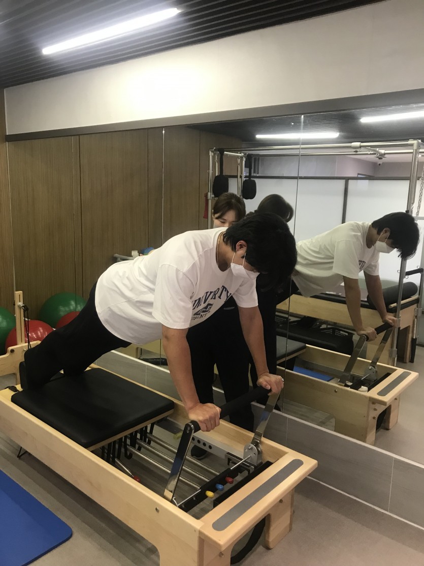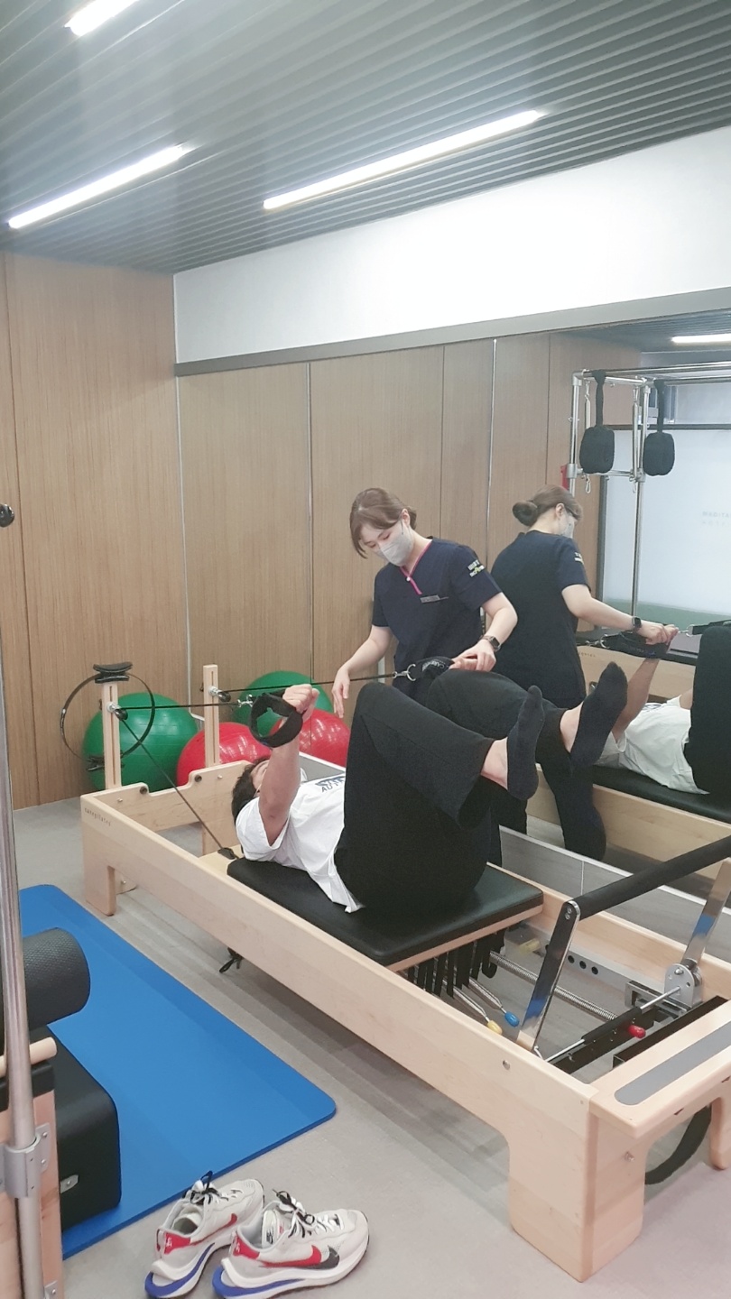 허리, 고관절굽힘근스트레칭과 어깨근육 강화및 코어운동을 시행하였습니다.