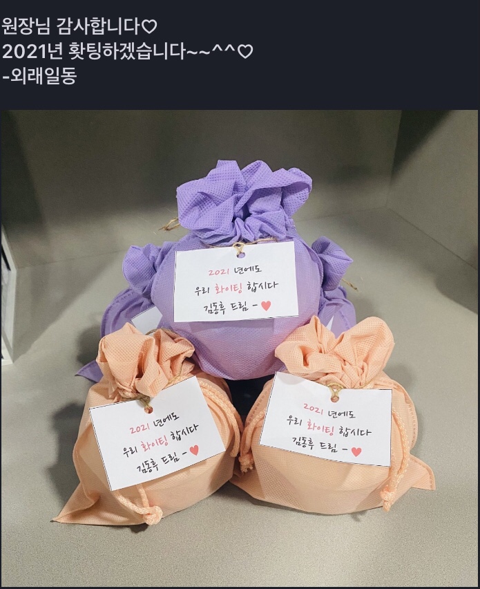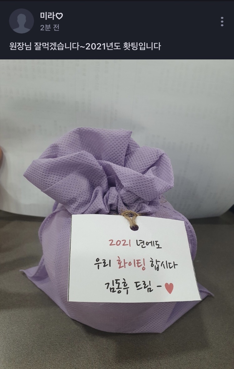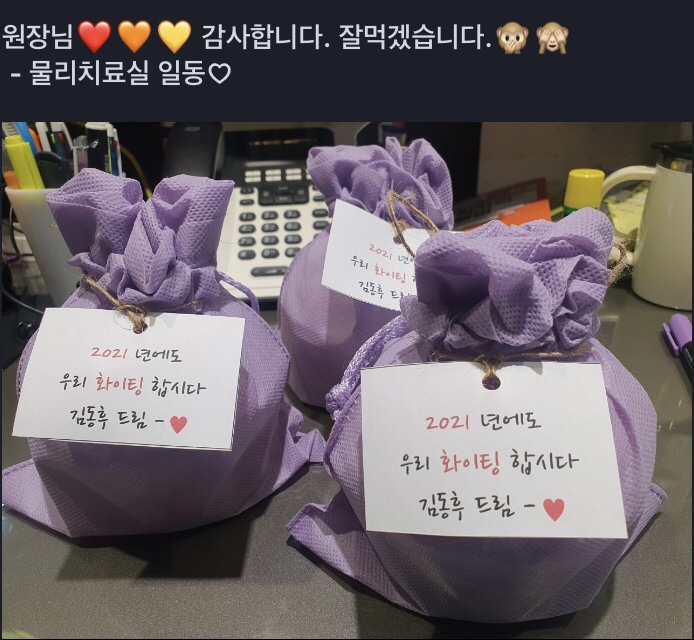 마디탄탄병원 직원들을 위한 김동후 대표원장님의 특별 선물!! 페이지 정보 작성자 최고관리자 댓글 0건 조회 1,374회 작성일 21-01-07 17:47 본문 2021 년에도 우리 화이팅 합시다. -김동후 드림- 목록 이전글2021년01월 월례조회 21.01.13 다음글12월25일 크리스마스/1월1일 신정 오전 진료 안내 20.12.24 댓글목록 댓글목록 등록된 댓글이 없습니다.