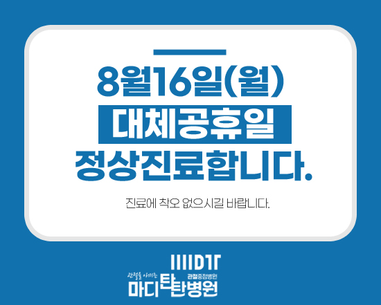 8월 16일(월) 대체공휴일 진료합니다. 페이지 정보 작성자 최고관리자 댓글 0건 조회 933회 작성일 21-08-10 10:18 본문 8월 16일(월) 대체공휴일 진료합니다. 목록 이전글대구 상원고등학교 야구부 포수 김윤서 선수 21.08.10 다음글2021년 07월 월례조회 21.07.14 댓글목록 댓글목록 등록된 댓글이 없습니다.