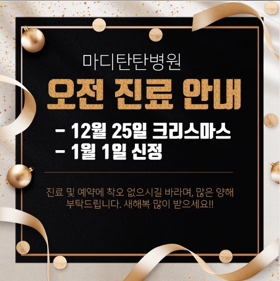 12월25일 크리스마스/1월1일 신정 오전 진료 안내 페이지 정보 작성자 최고관리자 댓글 0건 조회 1,053회 작성일 20-12-24 17:18 본문 오전 진료 안내- 12월25일 크리스마스 - 1월1일 신정 진료 및 예약에 착오 없으시길 바랍니다. 목록 이전글마디탄탄병원 직원들을 위한 김동후 대표원장님의 특별 선물!! 21.01.07 다음글2020년 12월 월례조회 20.12.15 댓글목록 댓글목록 등록된 댓글이 없습니다.