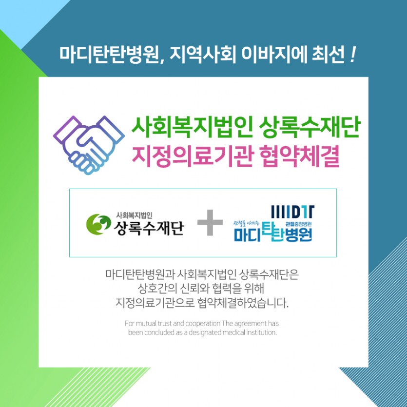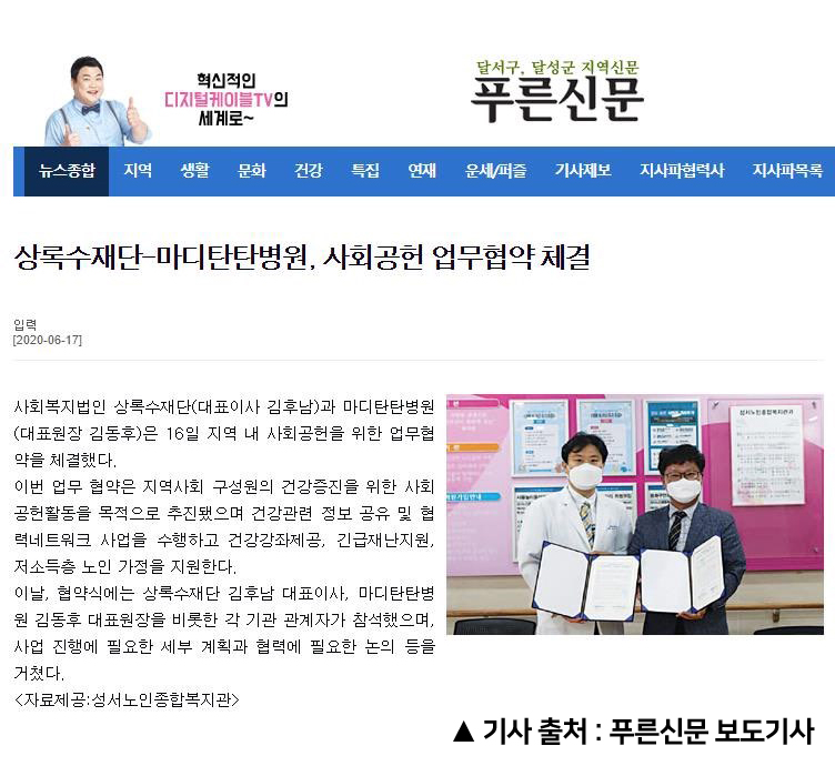 사회복지법인 상록수재단 지정의료기관 협약체결 페이지 정보 작성자 최고관리자 댓글 0건 조회 1,034회 작성일 20-06-22 11:52 본문 사회복지법인 상록수재단 지정의료기관 협약체결 목록 이전글마디탄탄병원 SNS 및 블로그 홍보 시상식 20.07.16 다음글김동후 대표원장 관절척추수술 9000례 달성! 20.06.03 댓글목록 댓글목록 등록된 댓글이 없습니다.